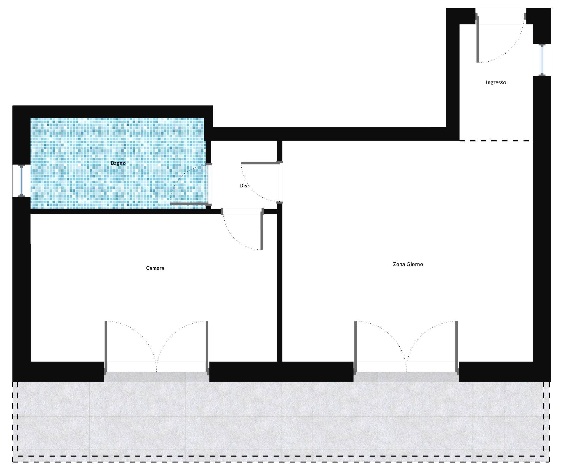 L'appartamento si distingue per una distribuzione degli spazi razionale e funzionale: piccolo ingresso, luminosa zona giorno con angolo cottura e accesso diretto all'ampia loggia coperta di 14 mq; disimpegno notte, camera matrimoniale anch'essa con accesso alla loggia e bagno finestrato. La continuità tra zona living, camera e spazio esterno valorizza la fruibilità dell'immobile e amplifica la percezione degli ambienti.