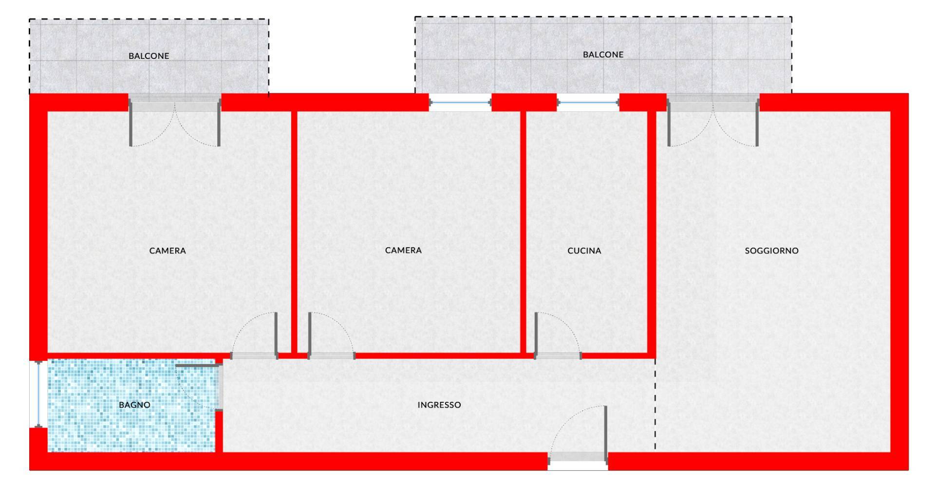 L'appartamento si apre su un accogliente soggiorno con accesso al balcone, affiancato da un pratico cucinotto separato. La zona notte offre due ampie camere matrimoniali, di cui una con balcone, e un bagno finestrato con doccia.